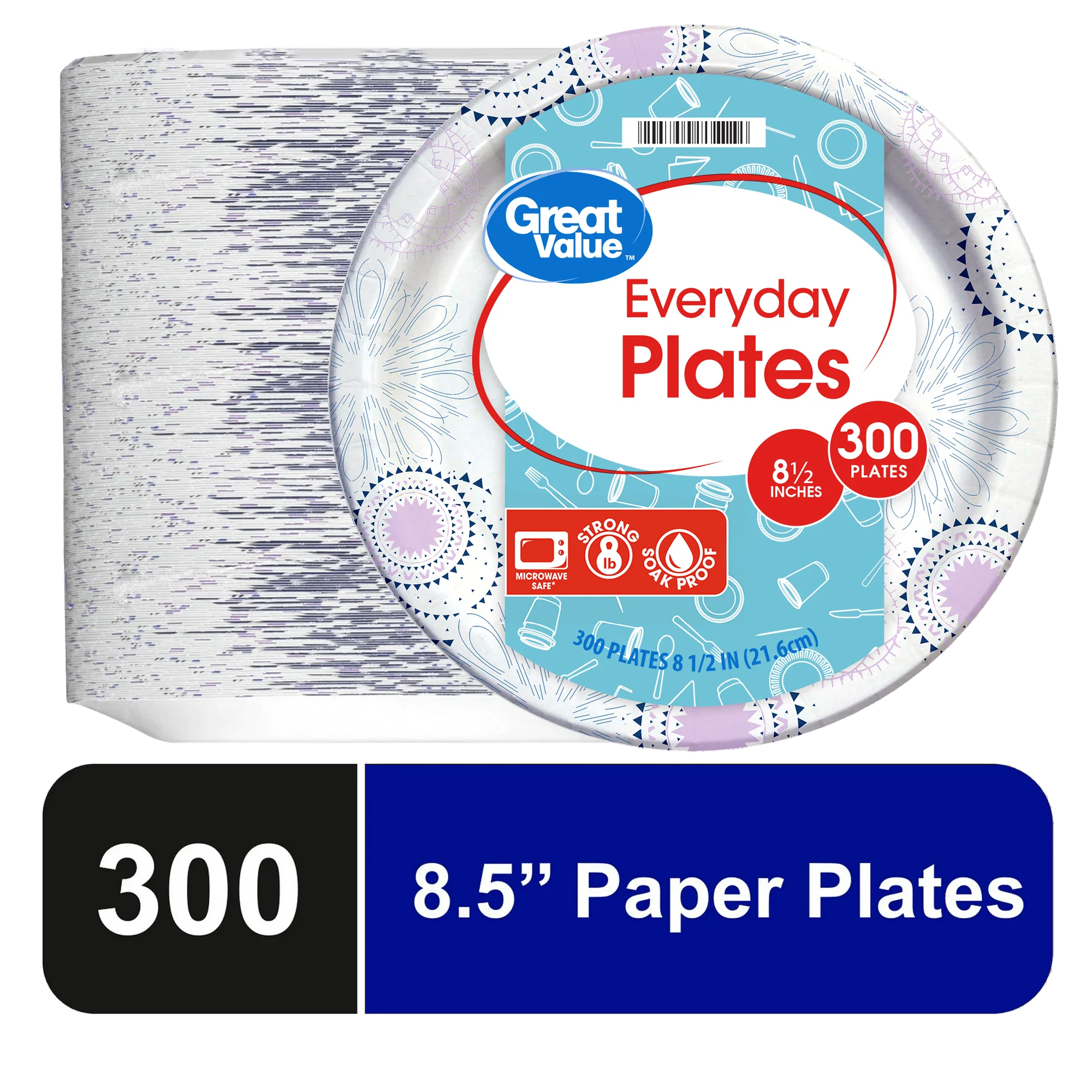 Great Value Everyday Disposable Paper Plates are the perfect addition to any entertaining outdoor event, office party or casual backyard meal with your family. These nearly 9-inch wide plates give you plenty of room to pile up more tasty treats than ever before and with 300 plates in every package, you can rest assured there will be plenty to go around for all your guests. Our durable design not only gives you and your guests an easy surface to hold on to, but it’s also soak-proof and microwave-safe. That way, whether you’re chowing down on creamy macaroni and cheese or want to drizzle a little extra dressing on your salad, you’re all set with Great Value Everyday Disposable Paper Plates.